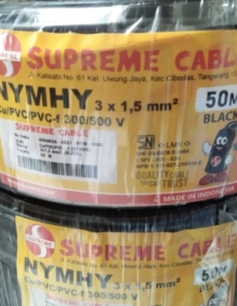 *Harga Hubungi CSKabel Listrik Tipe : NYYHY Jenis : Serabut Tembaga Warna kulit luar : Hitam Ukuran : 3×1,5 mm2 Isi : 3 core (3 kabel) Panjang per rol : 50 meter Merk : Supreme
